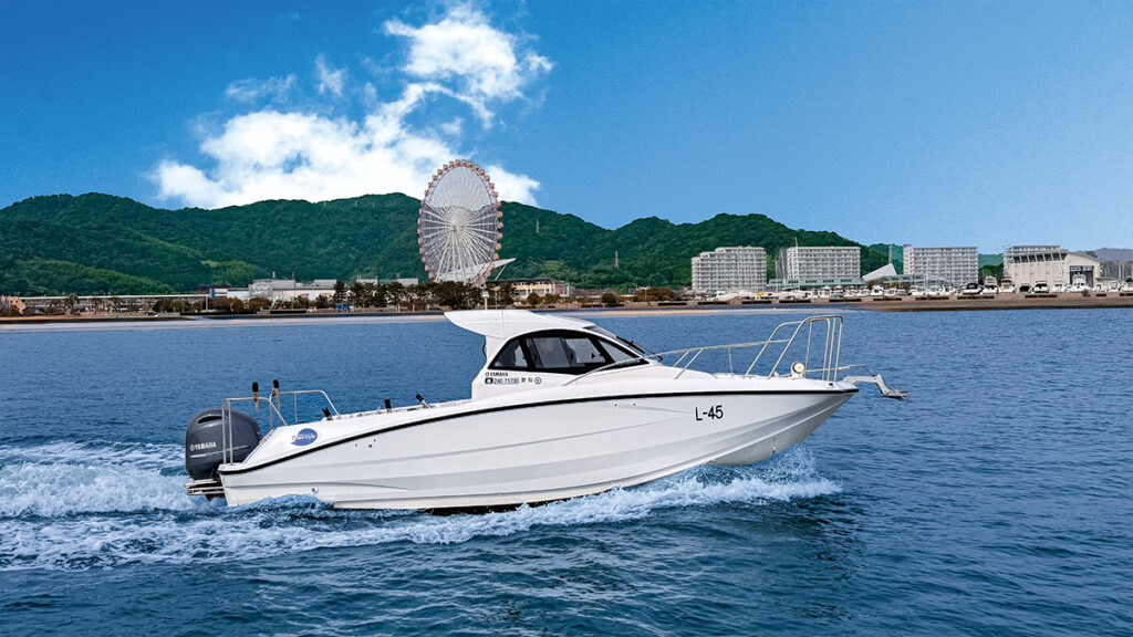 キャビン付の20フィートは、開放感のある船内で雨や風を防ぎ、4人が着座可能です。操船しやすい教習艇です。